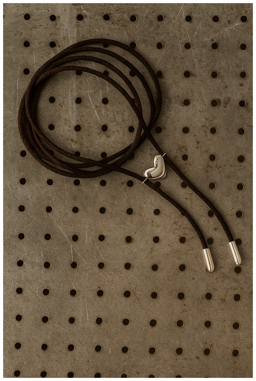 Heartline is a modern bolo necklace built around a sculptural 925 sterling silver heart charm. The pendant isn’t soft or sentimental — its shape is sharp, curved, and protective, like a heartbeat under armor.